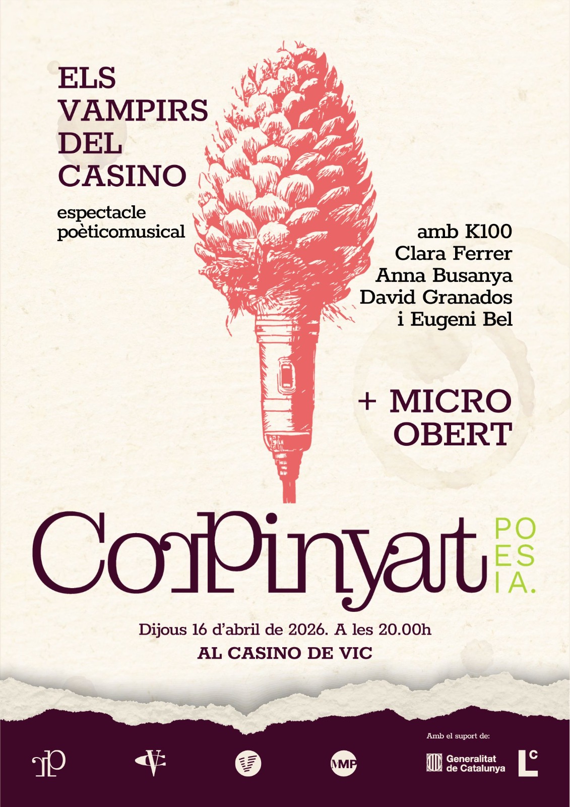Vic, 8 d’abril de 2026. Avui, a la Sala Verdaguer del Casino de Vic, hem explicat Corpinyat, una nova iniciativa cultural que vol esdevenir un espai estable de trobada per a la poesia contemporània, amb especial atenció a la producció dels autors de la Plana de Vic.
